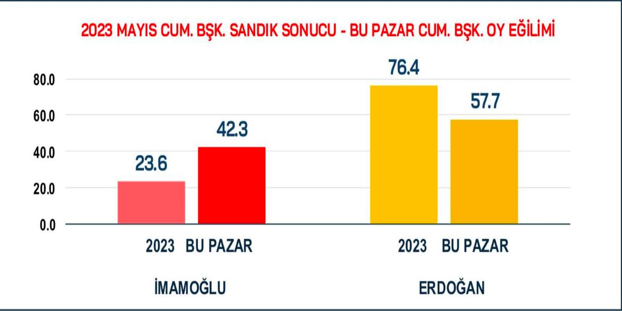 Mitingden bir hafta sonra, 25-26 Nisan tarihlerinde yapılan anketin sonuçlarına göre, (Kararsızlar dağıtıldığında) Cumhur İttifakı’nın 2023’te yüzde 66.9 olan oyunun yüzde 51.8’e düştüğü görüldü.