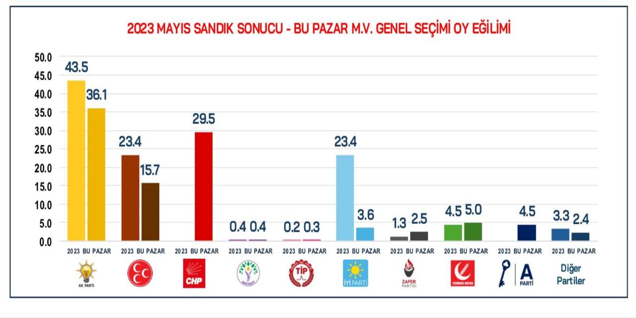 AK Parti’nin 2023’te yüzde 43.5 olan oyunun yüzde 36.1’e, MHP’nin yüzde 23.4 olan oyunun yüzde 15.7’ye düştüğü görüldü.