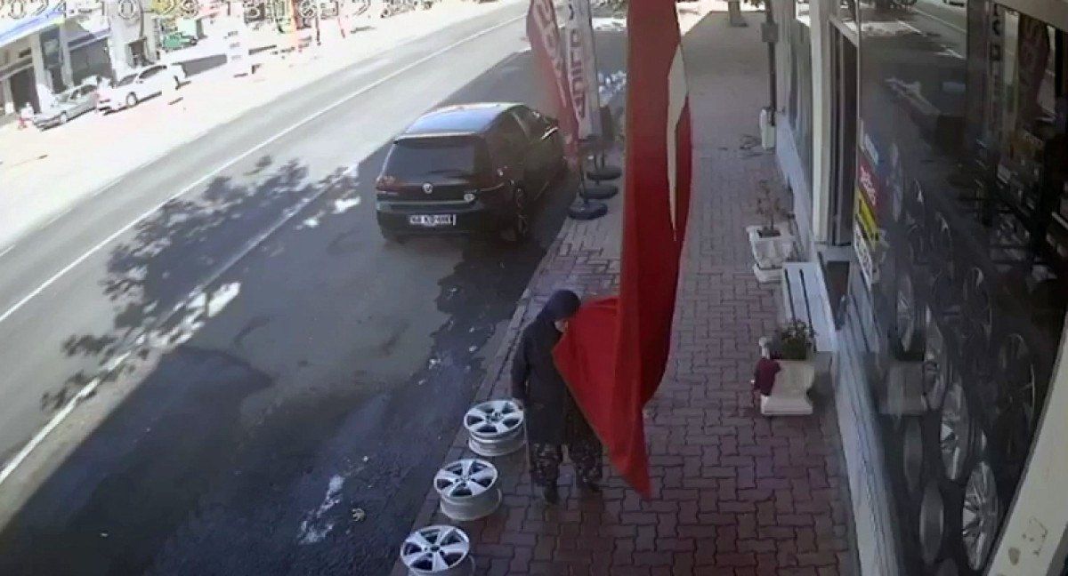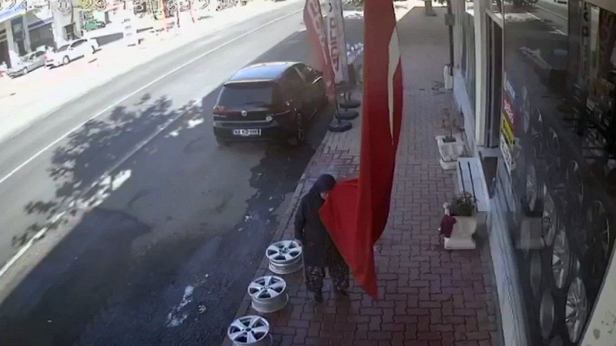 O anlar iş yerinin güvenlik kamerasına yansıdı. Bayrağı öpen kadın, daha sonra yoluna devam etti.