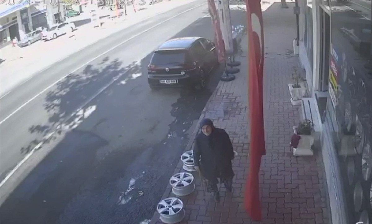 Ortahisar ilçesinde elinde bastonuyla kaldırımda yürüyen bir kadın, bir lastikçiye ait dükkanın önüne asılı olan Türk bayrağını görünce öptü.