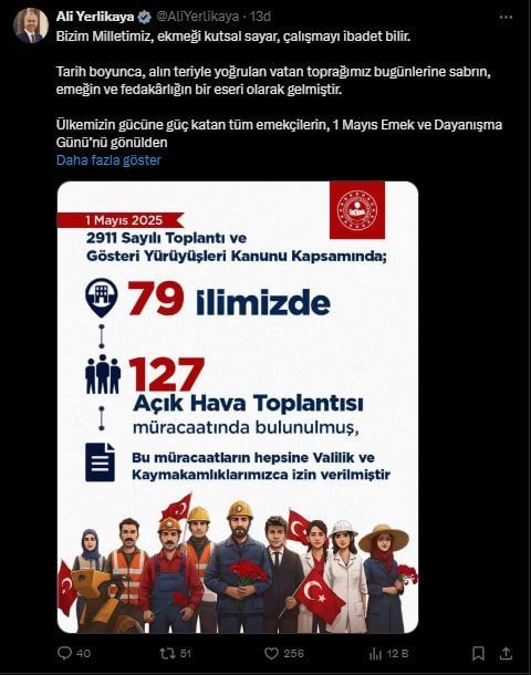 1 Mayıs Emek ve Dayanışma Günü nedeni ile paylaşım yapan İçişleri Bakanı Ali Yerlikaya, kutlamalara ilişkin bilgi verdi.