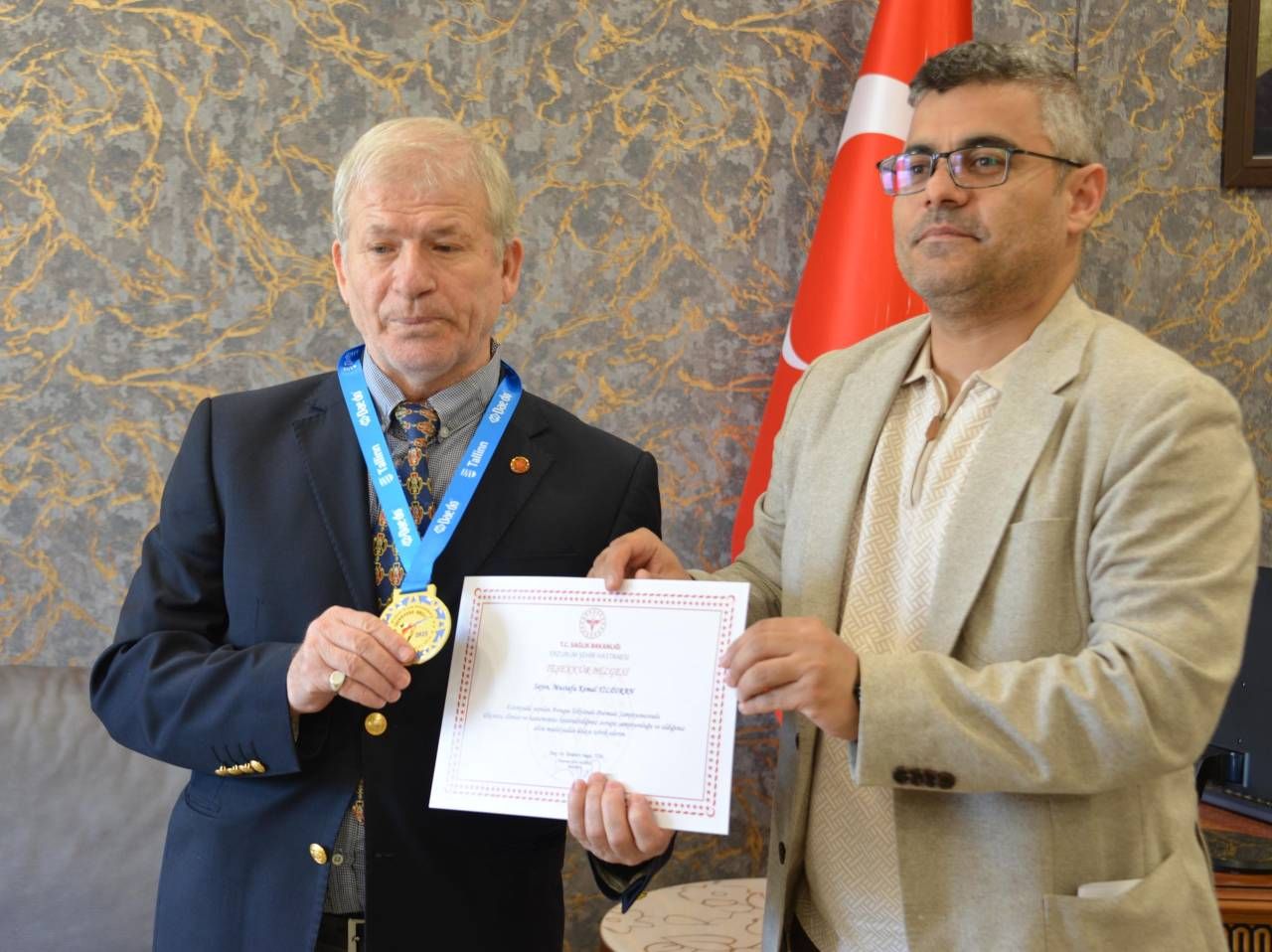 Şampiyona sonrası Erzurum’a dönen başarılı sporcu Mustafa Kemal Yıldıran, madalyasıyla Erzurum Şehir Hastanesi Başhekimi Doç.Dr. İbrahim Hakkı Tör’ü ziyaret etti. Şampiyona hakkında bilgi veren Yıldıran’ı tebrik eden Başhekim Tör, başarısı için kutladı. Başhekim Tör, Yıldıran’a başarı belgesi ve çiçek verdi.