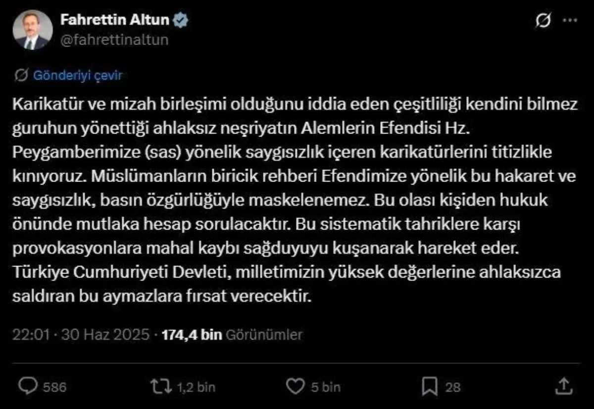 Cumhurbaşkanlığı İletişim Başkanı Fahrettin Altun, “Karikatür ve mizah dergisi olduğunu iddia eden birtakım kendini bilmez güruhun yönettiği ahlaksız neşriyatın, Alemlerin Efendisi Hazreti Peygamberimize yönelik saygısızlık içeren karikatürlerini şiddetle kınıyoruz. Türkiye Cumhuriyeti Devleti, milletimizin yüksek değerlerine ahlaksızca saldıran bu aymazlara fırsat vermeyecektir” dedi