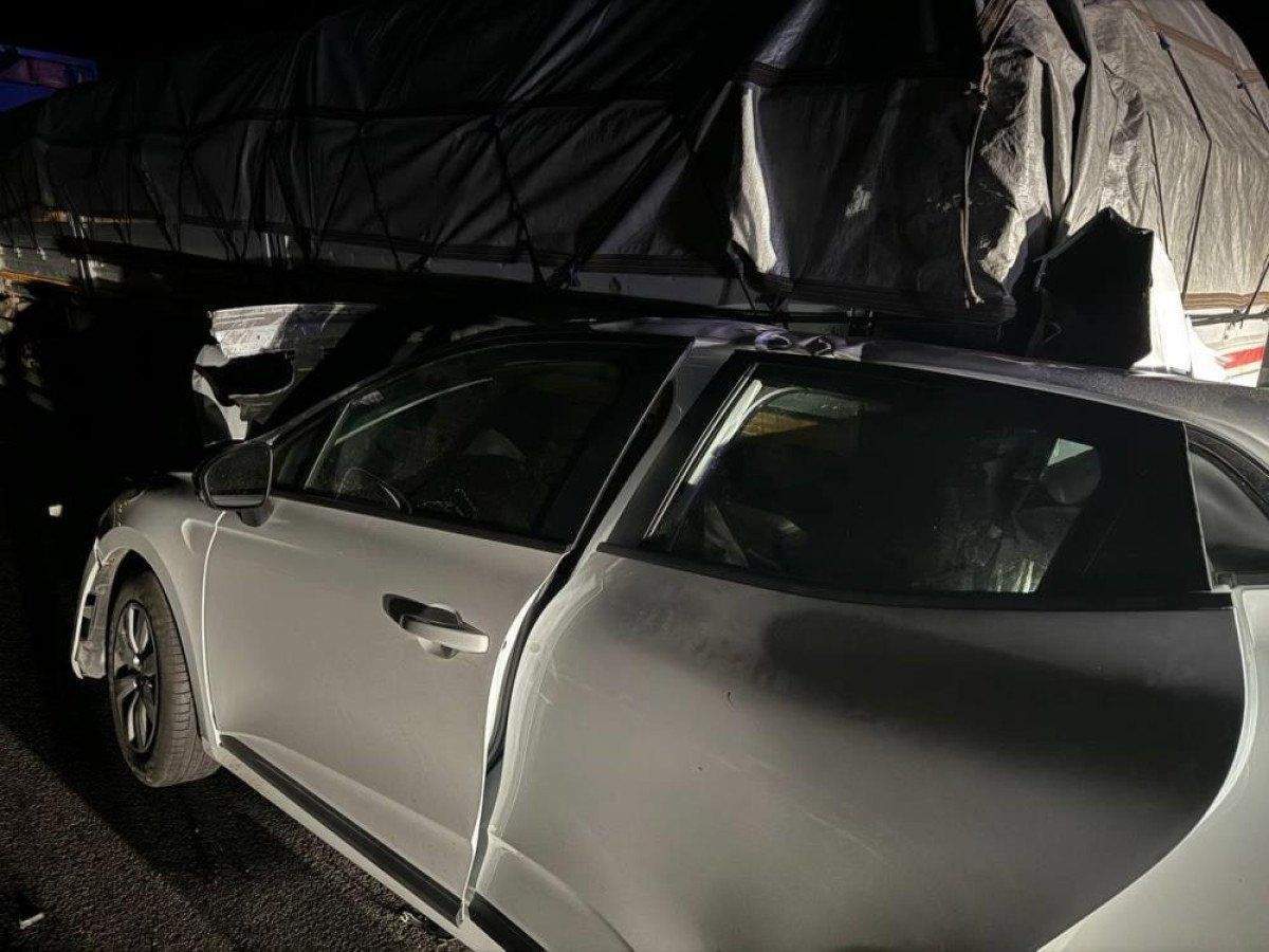 Tırın dorse kısmına saplanan otomobilden dışarı fırlayan çocuk koltuğu ve ilkyardım çantası çarpışmanın boyutunu göz önüne serdi.