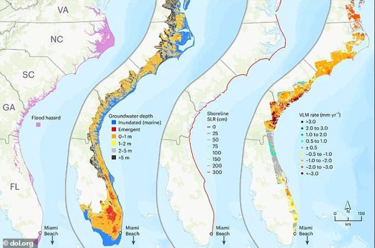 ABD Jeoloji Araştırmaları Kurumu (USGS) araştırmacıları, 2100 yılına gelindiğinde ABD Doğu Sahili’nin; yükselen deniz seviyeleri, su baskınları ve batan topraklar nedeniyle ciddi şekilde etkileneceğini öngörüyor.