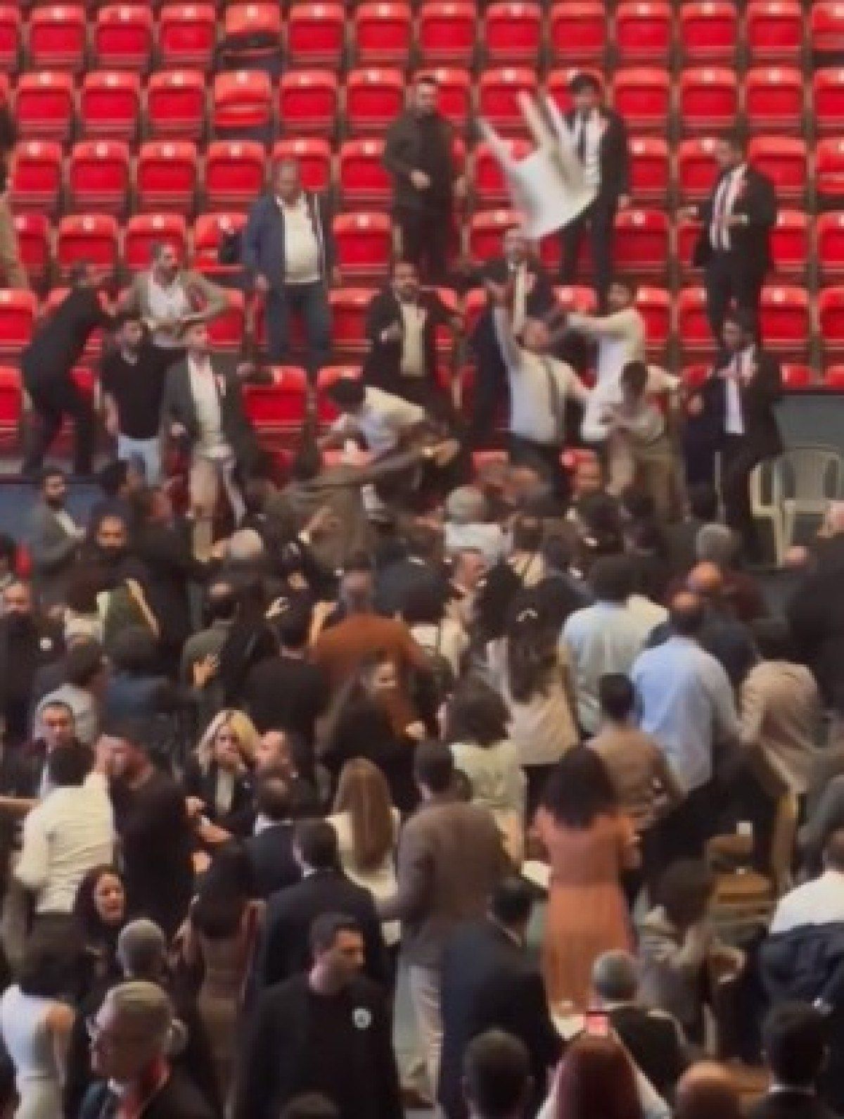 Bu sloganın ardından salonda gerginlik baş gösterdi. Diğer bir grup, “Ne Mutlu Türküm Diyene” sloganlarıyla karşılık verince ortam bir anda gerildi ve iki grup arasında kargaşa çıktı.
