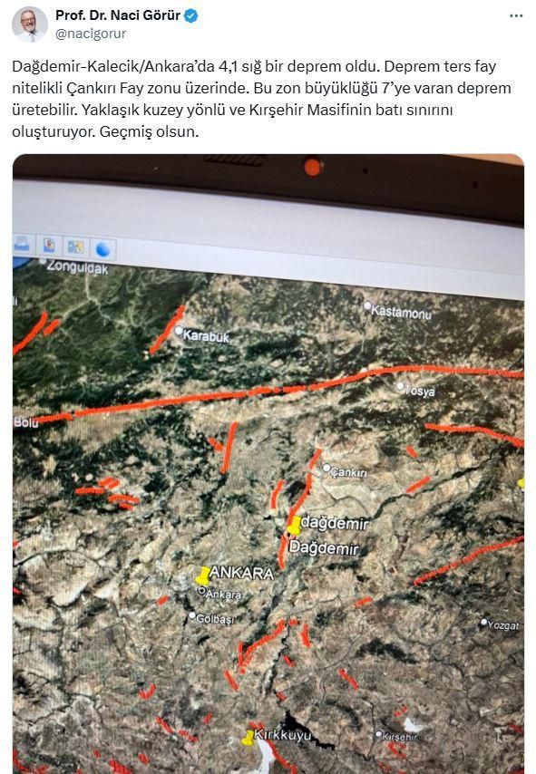 Depremin ters fay nitelikli olduğuna işaret eden Görür, fay hattının yaklaşık kuzey yönlü ilerlediğini ve Kırşehir Masifi’nin batı sınırını oluşturduğunu ifade etti. Görür, “Dağdemir-Kalecik/Ankara’da 4.1 büyüklüğünde sığ bir deprem oldu. Geçmiş olsun” mesajı da paylaştı.