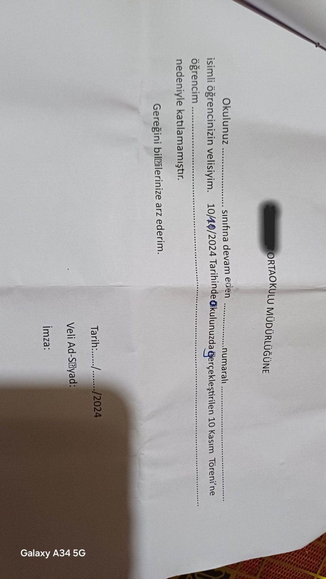 Gönderilen metinde; “Öğrencinizin 10 Kasım 2024 tarihinde okulda gerçekleştirilen 10 Kasım törenine katılmadığı tespit edilmiş olup, katılmama gerekçesini 3 iş günü içerisinde ekte yer alan matbu dilekçede tarafımıza bildirmeniz hususunda gereğini rica ederim.” ifadeleri yer aldı.