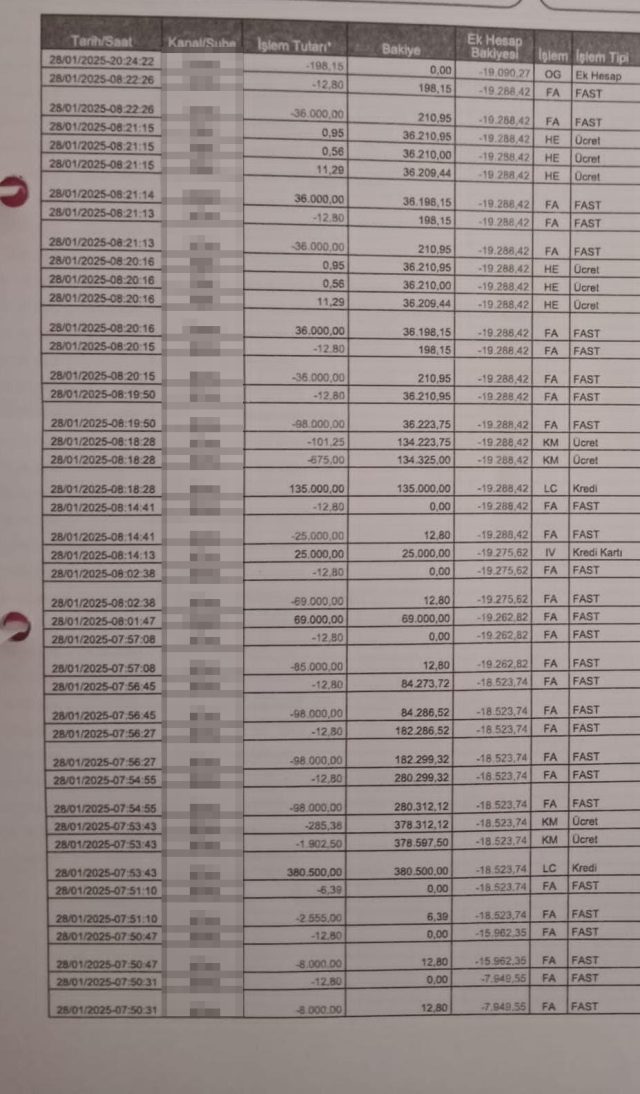 Selda K., 28 Ocak’ta şarjı dolu olan şifresiz kullandığı telefonunu başucuna koyarak uyudu. Sabah saat 10.00 sıralarında uyandığında telefonunun kapalı olduğunu, açmak istediğinde de şifre konulduğunu fark etti. Evinin yakınında bulunan telefoncuda telefonunu açtıran Selda K., mobil bankacılık bilgileri kullanılarak 3 farklı bankadaki hesaplarında bulunan para ile bir bankadan adına çekilen 2 kredi tutarının Muhammet B. ve Engin K.’ye parça parça gönderildiğini gördü. Toplam 628 bin 500 TL dolandırıldığını iddia eden Selda K., hesaplarına bloke koydurdu. Selda K., işlemin kendisine ait olmadığını ve paranın transfer edildiği hesap sahiplerini tanımadığını ileri sürerek, Ankara Cumhuriyet Başsavcılığı’na suç duyurusunda bulundu.