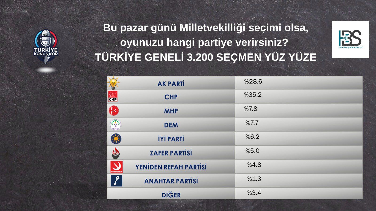 Anket sonuçlarına göre AKP yüzde 28,6 oy aldı. CHP ise yüzde 35,2 oy oranı ile yine birinci parti konumunda. AKP’nin ittifakı olan MHP’nin yüzde 7.8, DEM Parti’nin yüzde 7,7 aldıkları görüldü.
