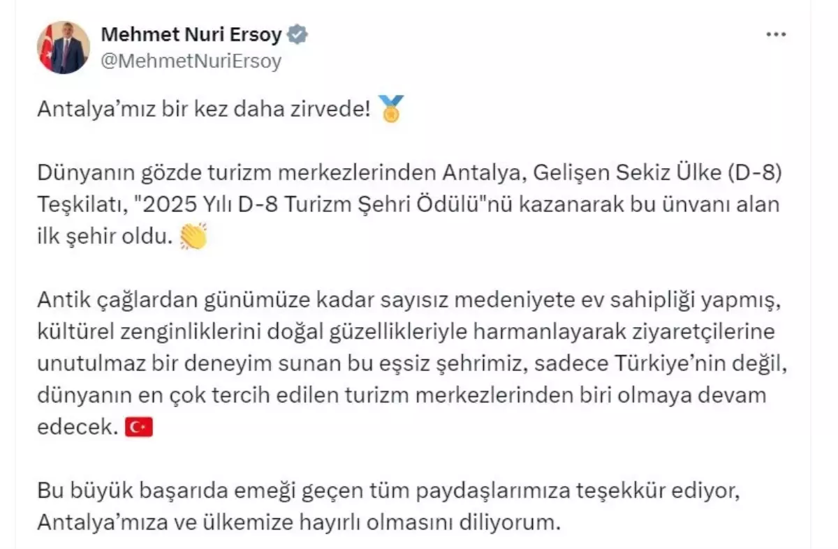 Kültür ve Turizm Bakanı Mehmet Nuri Ersoy, Antalya'nın 2025 Yılı D-8 Turizm Şehri Ödülü'nü kazanarak bu unvanı elde eden ilk şehir olduğunu açıkladı. Antalya'nın kültürel ve doğal güzellikleriyle dünya genelinde önemli bir turizm merkezi olduğuna vurgu yaptı.