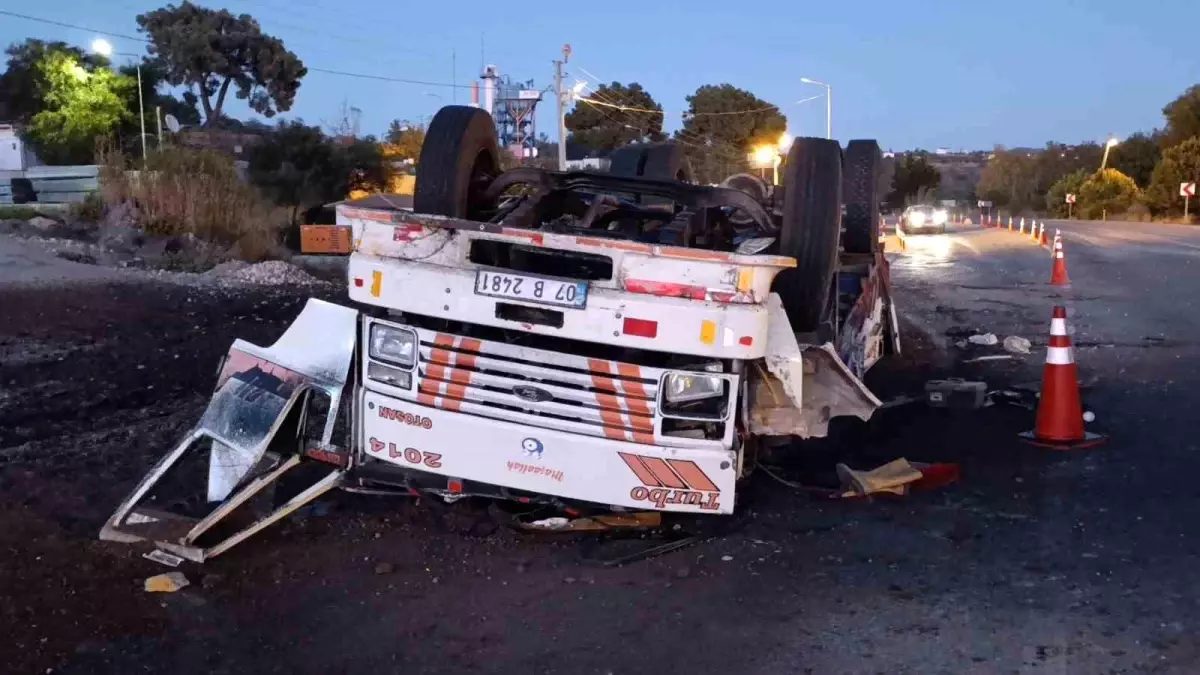 Antalya'da freni patlayan kamyon, kontrol noktası çıkışında devrildi; sürücü hastaneye kaldırıldı.