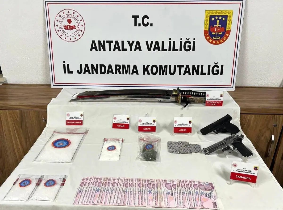 Antalya İl Jandarma Komutanlığınca yürütülen çalışmalar sonucu, Antalya Cumhuriyet Başsavcılığı talimatlarıyla Döşemealtı ilçesinde operasyon düzenlendi. İl Jandarma Komutanlığı Narkotik Şube Müdürlüğü, İstihbarat Şube Müdürlüğü ve Döşemealtı İlçe Jandarma Komutanlığı ekiplerinin müşterek aramasında şüphelinin evinde 1 kilo 374 gram metamfetamin, 84 gram kokain, 127 gram esrar, 36 adet uyuşturucu hap, 2 tabanca, 2 kılıç ve suçtan elde edildiği değerlendirilen 9 bin lira ele geçirildi.