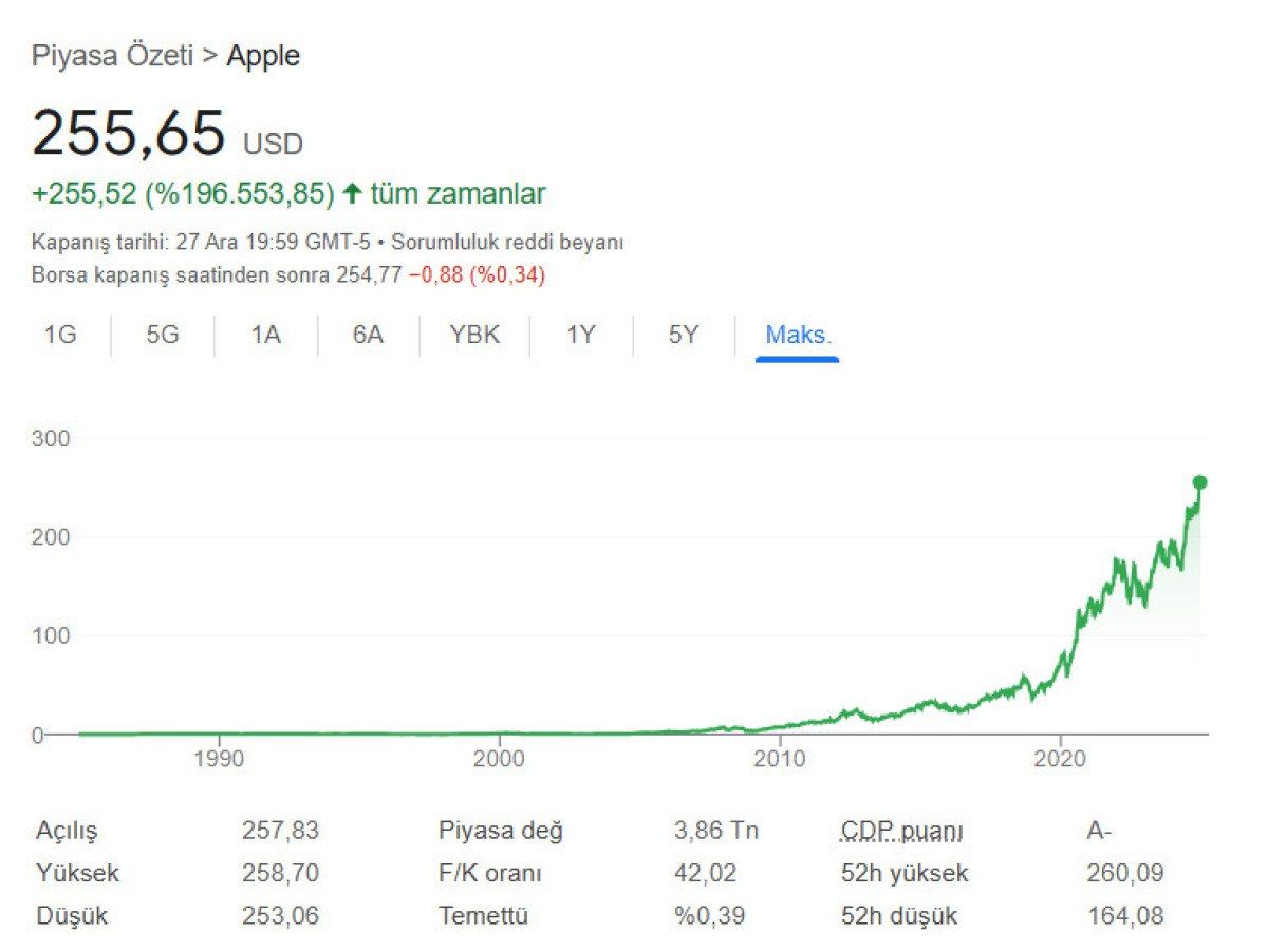 Apple, Aralık 1980’de 22 dolardan halka arz edilmişti. Hisse bölünmeleri hesaba katıldığında, halka arzda 1.000 dolarlık Apple hissesi alan birinin bugünkü hisselerinin değeri 2 milyon 576 bin 952 dolar olacaktı.