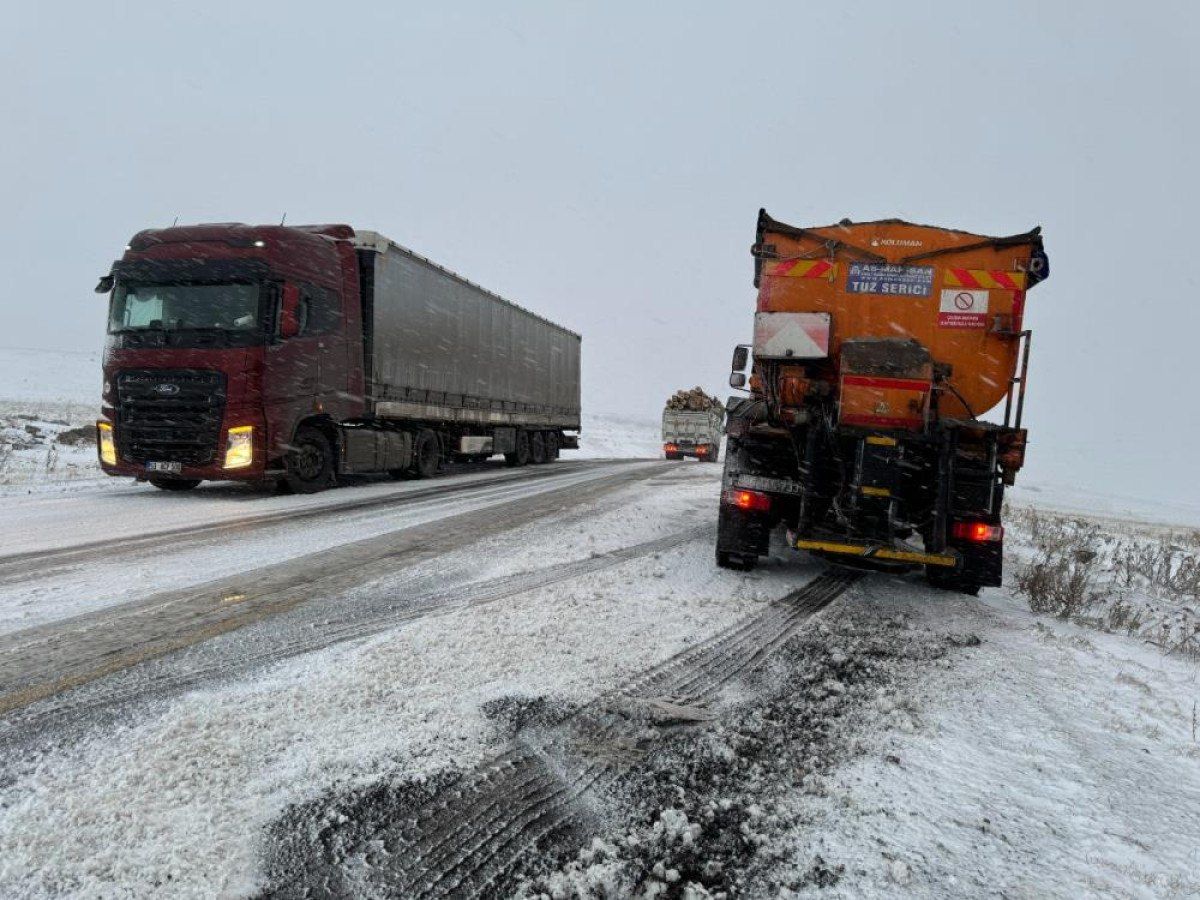 Ekipler yolun kapanmaması için aralıksız çalışmalarını sürdürürken, bir yandan da buzlanma yaşanan yolda tuzlama çalışması başlattı.