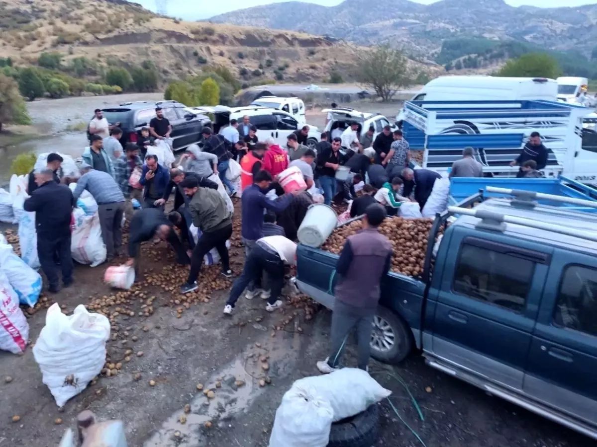 Siirt’in Baykan ilçesinde patates yüklü bir kamyonet arıza yapınca, sürücüsü zarar gören patatesleri vatandaşlara ücretsiz dağıttı. O anlar cep telefonu kamerasıyla kaydedildi.