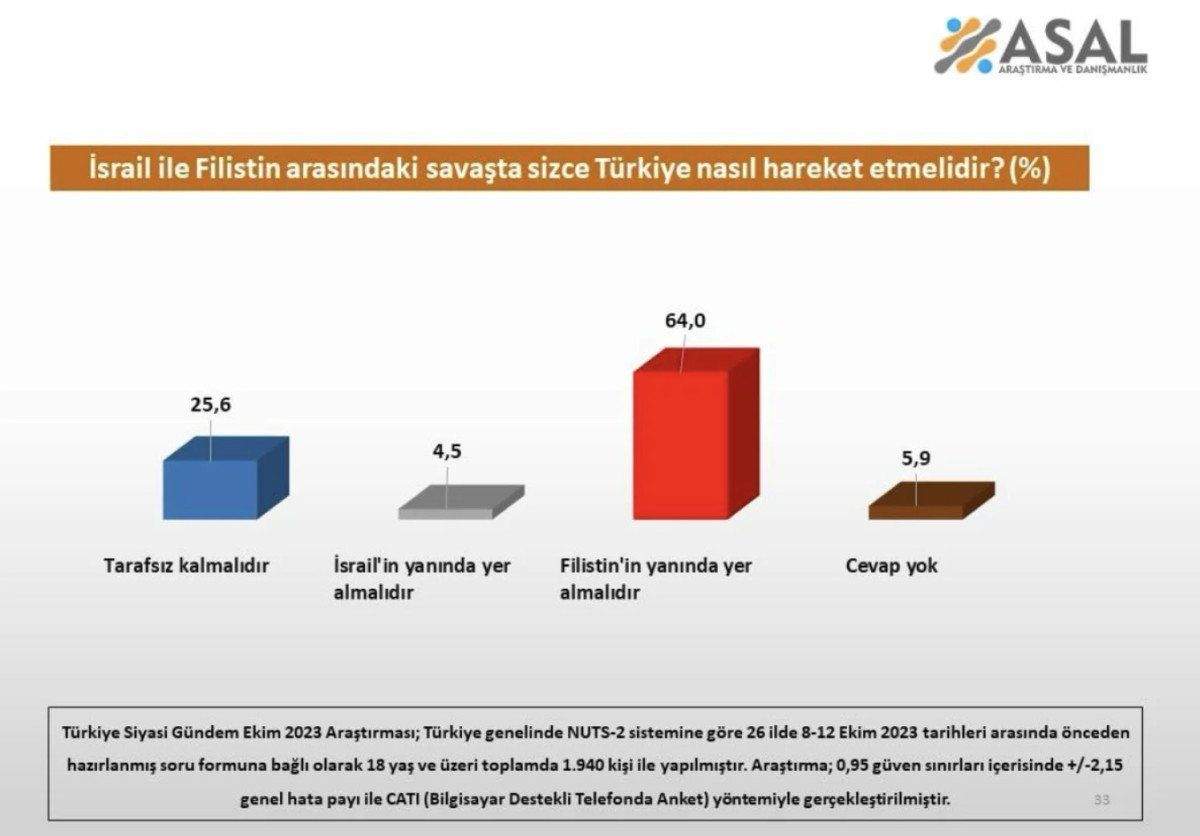 Araştırmada, vatandaşlara 7 Ekim’de İsrail’in Filistin’e yönelik saldırıları başladığında Türkiye’nin alacağı tutum soruldu.