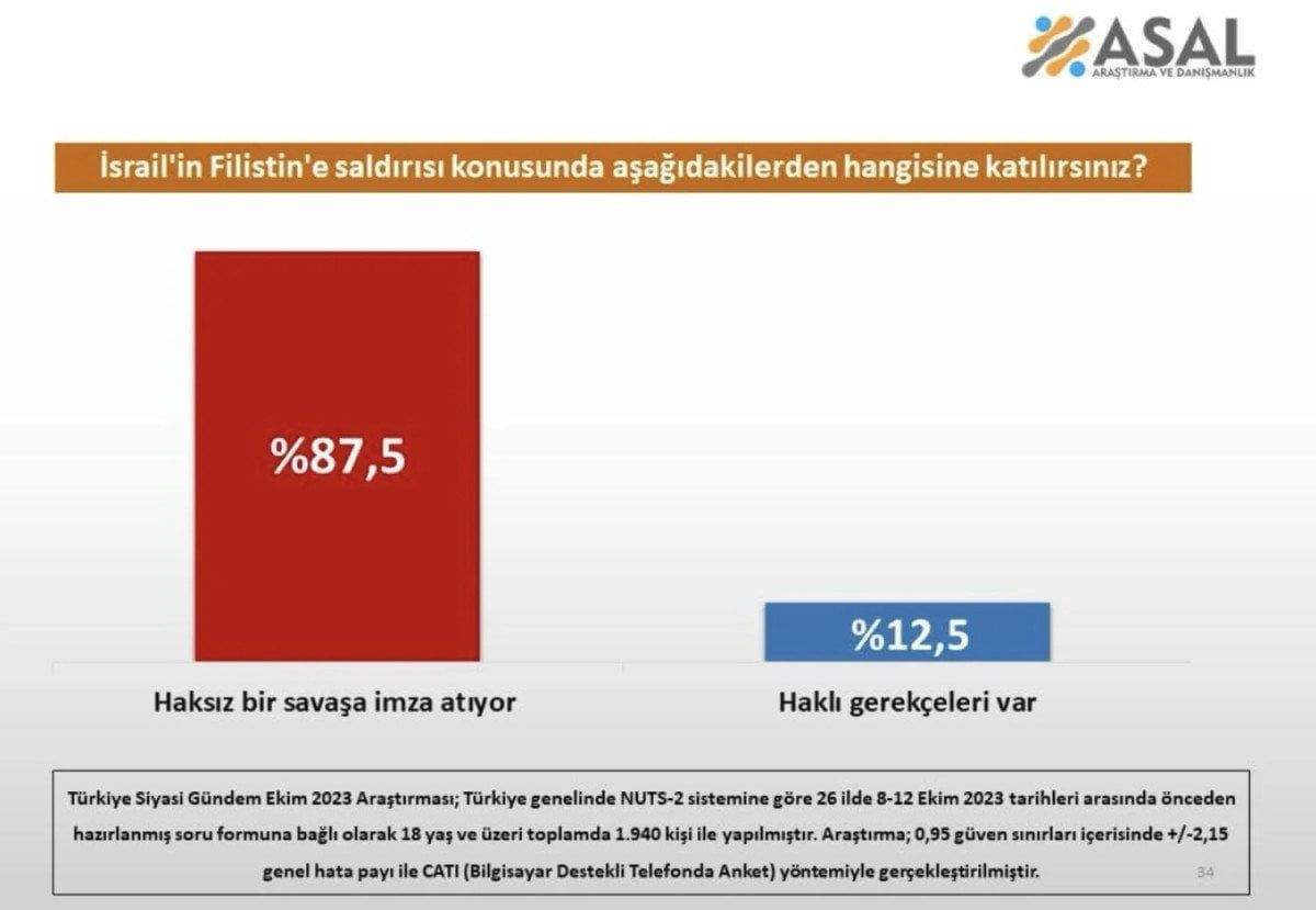 Asal Araştırma tarafından vatandaşlara ayrıca “İsrail’in Filistin’e saldırısı konusunda aşağıdakilerden hangisine katılırsınız?” sorusu da yöneltildi.