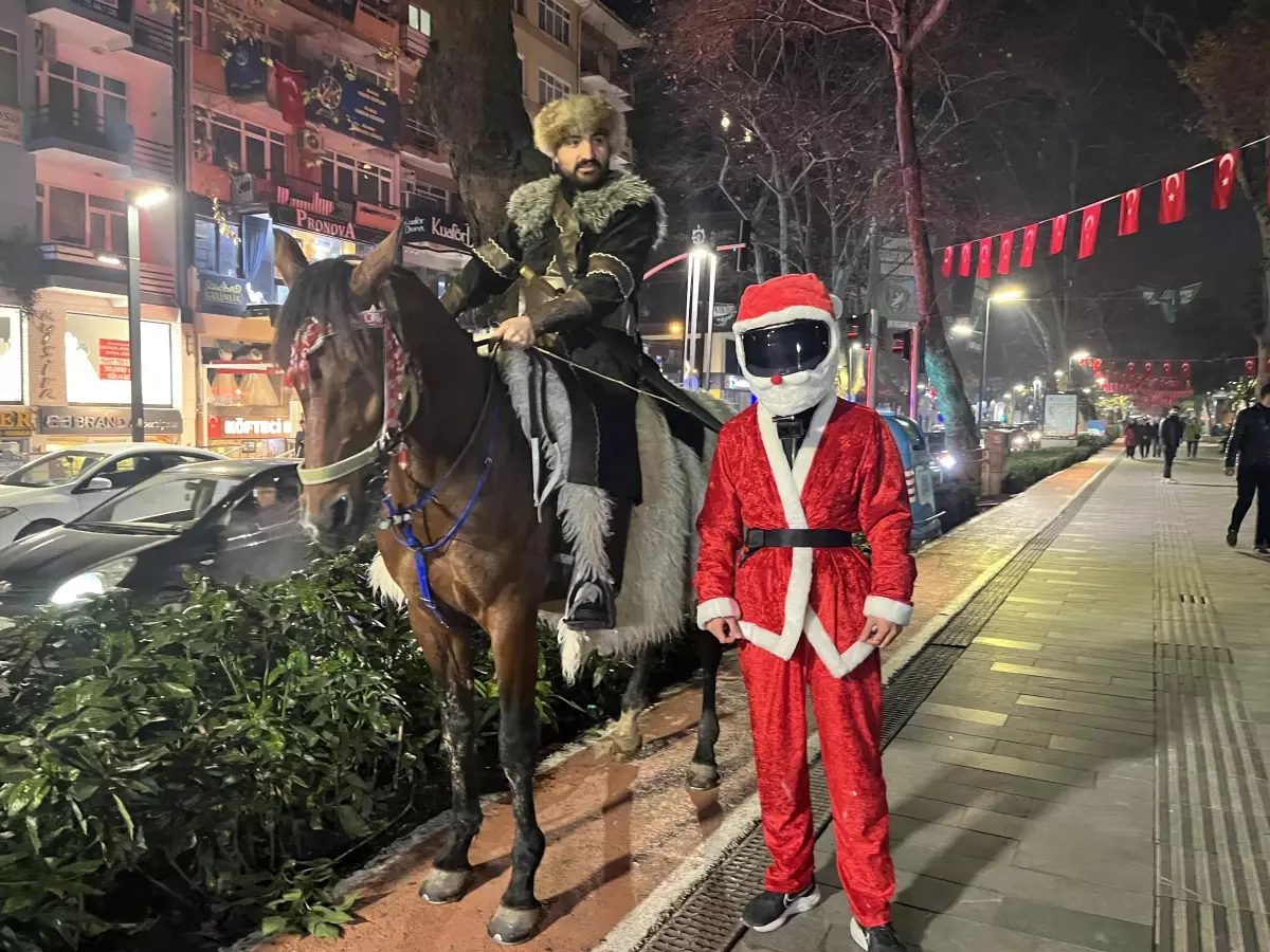 KOCAELİ’nin İzmit ilçesinde oto tamircisi Sümmani Yılmaz (35), yeni yıla dakikalar kala ‘Rüzgar’ isimli atıyla caddelerde dolaştı. Noel baba kostümlü kişiler ise at ile fotoğraf çektirdi.