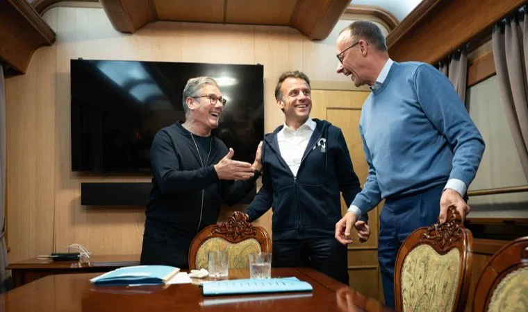 Rusya Dışişleri Bakanlığı Sözcüsü Mariya Zaharova, Telegram kanalından paylaştığı görüntüde , Fransa Cumhurbaşkanı Emmanuel Macron, Almanya Başbakanı Friedrich Merz ve İngiltere Başbakanı Keir Starmer bir arada duruyor.