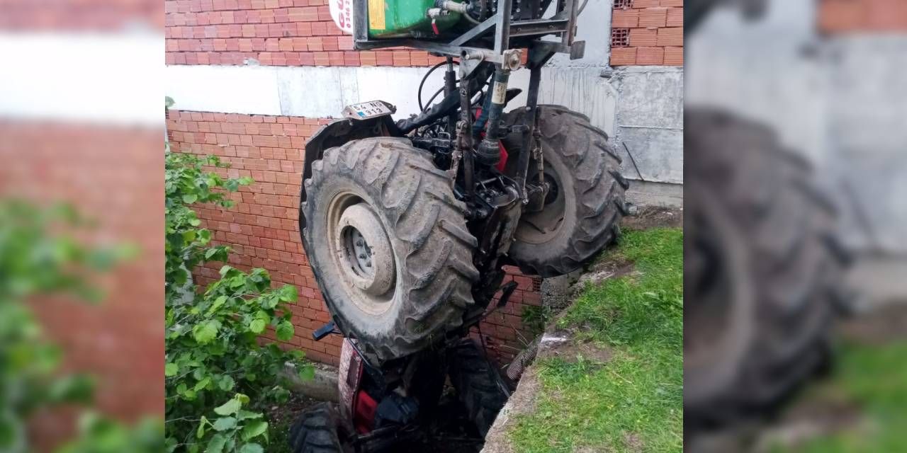 Mehmet Tiryaki‘nin kullandığı 54 NG 913 plakalı traktör, sürücüsünün direksiyon hakimiyetini kaybetmesi sonucu duvara çarptıktan sonra evlerinin yanındaki boşluğa düştü.