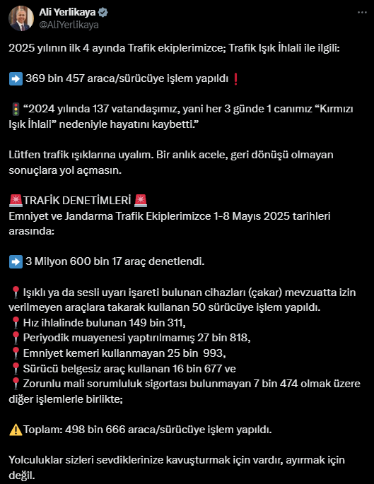 Bakan Yerlikaya, sadece 2024 yılı içerisinde 137 vatandaşın kırmızı ışık ihlali yüzünden yaşamını yitirdiğini belirterek, bu rakamın her üç günde bir ölüme karşılık geldiğini vurguladı. Açıklamasında, trafik kurallarına uymanın hayati önem taşıdığına dikkat çekti.