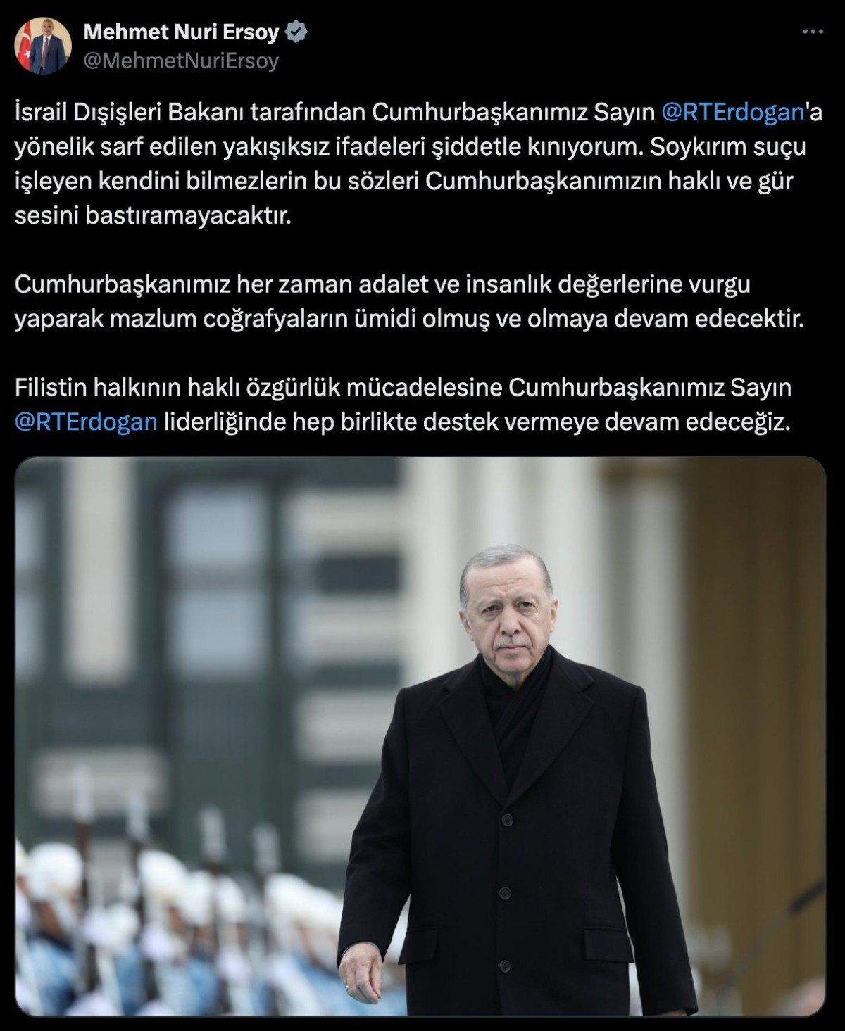 Kültür ve Turizm Bakanı Mehmet Nuri Ersoy, İsrail Dışişleri Bakanı Yisrael Katz'ın, Cumhurbaşkanı Recep Tayyip Erdoğan'ı hedef alan paylaşımına tepki göstererek, "Soykırım suçu işleyen kendini bilmezlerin bu sözleri, Cumhurbaşkanı'mızın haklı ve gür sesini bastıramayacaktır" dedi.