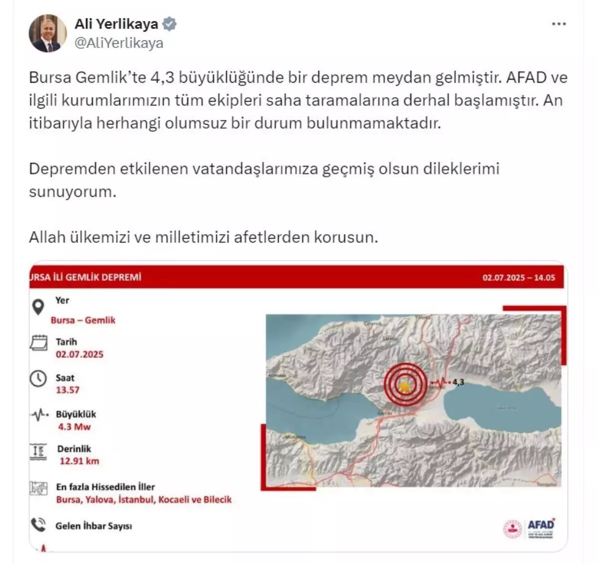 İçişleri Bakanı Ali Yerlikaya, depreme ilişkin sosyal medya hesabından açıklama yaptı. Yerlikaya, “Bursa Gemlik’te 4,3 büyüklüğünde bir deprem meydan gelmiştir. AFAD ve ilgili kurumlarımızın tüm ekipleri saha taramalarına derhal başlamıştır. An itibarıyla herhangi olumsuz bir durum bulunmamaktadır. Depremden etkilenen vatandaşlarımıza geçmiş olsun dileklerimi sunuyorum. Allah ülkemizi ve milletimizi afetlerden korusun” dedi.