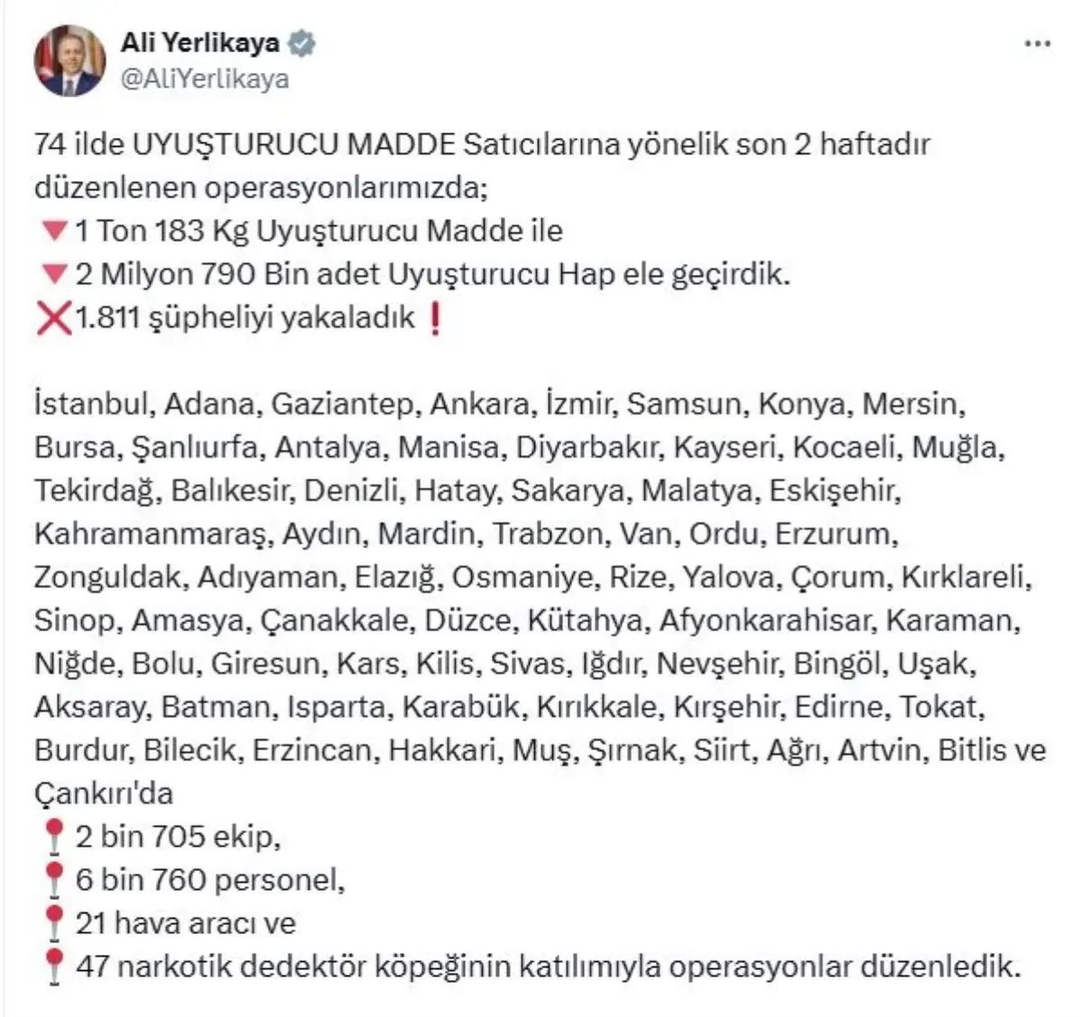 İÇİŞLERİ Bakanı Ali Yerlikaya, 74 ilde düzenlenen operasyonlarda 1 ton 183 kilogram uyuşturucu ile 2 milyon 790 bin uyuşturucu hap ele geçirildiğini, 1811 şüphelinin yakaladığını açıkladı.