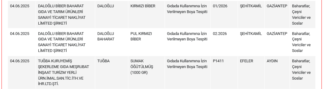 Bakanlık, sumak, pul biber ve kırmızı biberde sağlığı tehlikeye düşürecek boya tespitini paylaştı. Listede yer alan ürünler ve markaları şöyle: