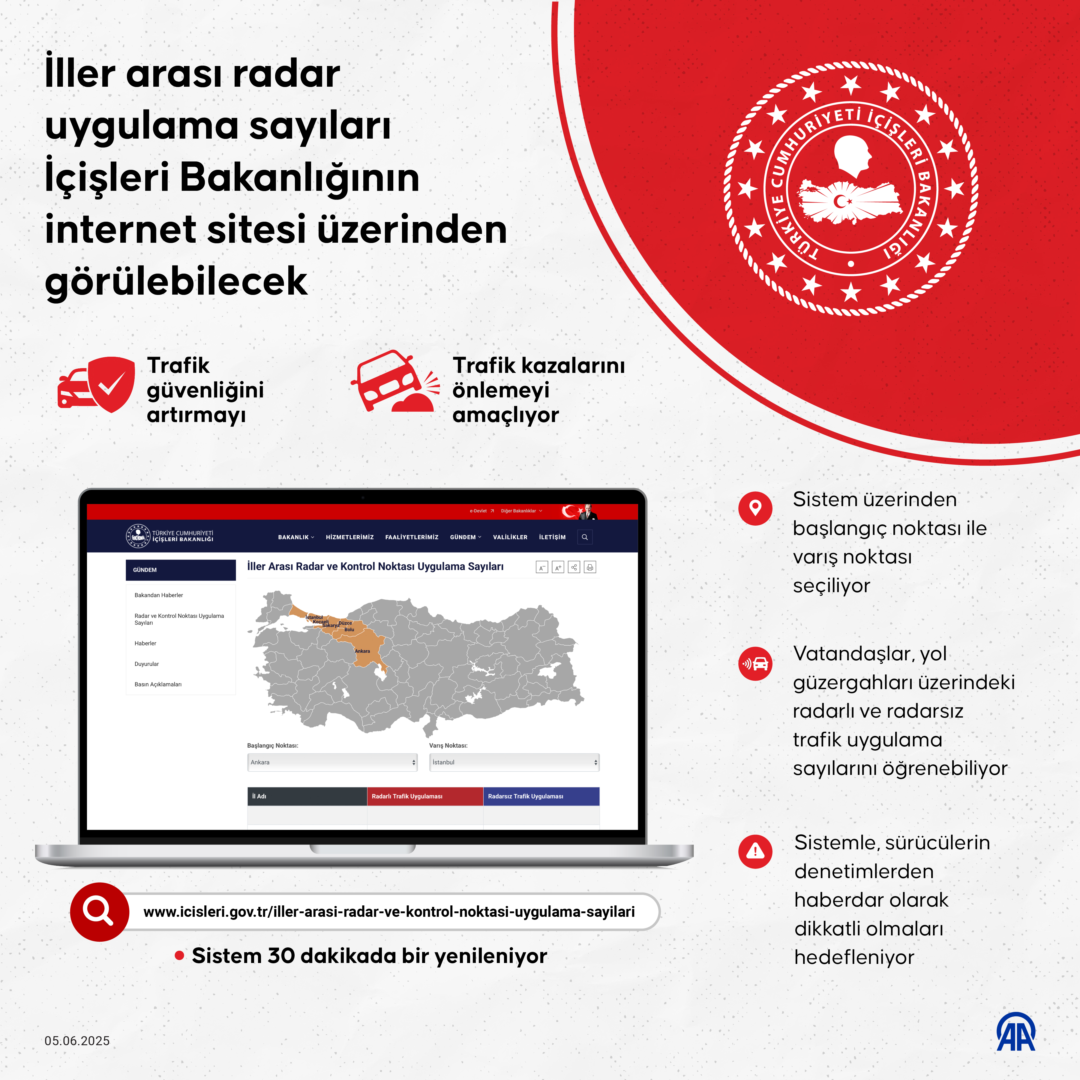 “https://www.icisleri.gov.tr/iller-arasi-radar-ve-kontrol-noktasi-uygulama-sayilari” internet adresinden ulaşılabilen bu sistemle, sürücülerin denetimlerden haberdar olarak dikkatli olmaları amaçlanıyor.
