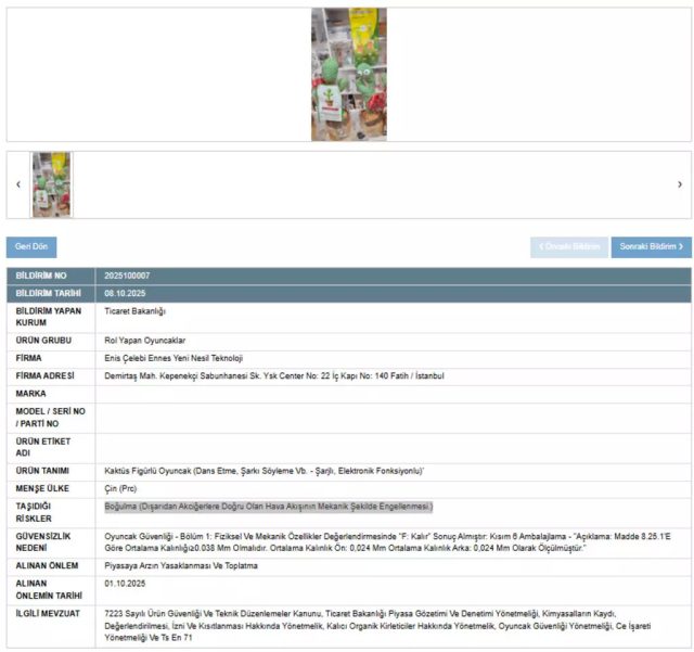 Denetim raporuna göre, “Enis Çelebi Ennes Yeni Nesil Teknoloji” firmasına ait oynayan kaktüs oyuncak, “Oyuncak Güvenliği – Bölüm 1: Fiziksel ve Mekanik Özellikler” testinde “F: Kalır” sonucu aldı. Ürünün ambalaj kalınlığının, mevzuatta belirtilen 0.038 mm standardına karşın 0.024 mm olarak ölçüldüğü tespit edildi.