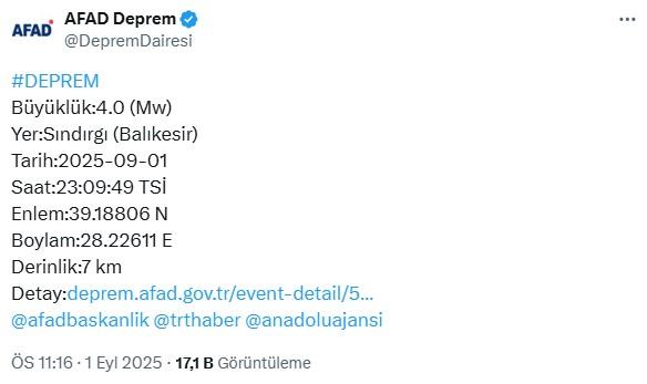 Balıkesir’in Sındırgı ilçesinde artçı depremler yaşanmaya devam ediyor. İlçede son olarak saat 23.09’da 4 büyüklüğünde deprem meydana geldi. AFAD, depremin yerin 7 kilometre derinliğinde gerçekleştiğini belirtti.