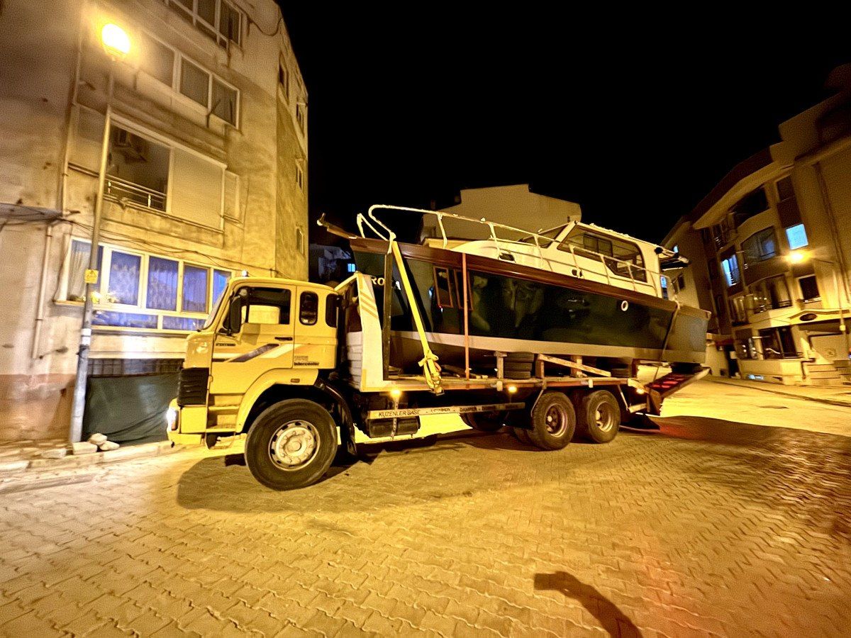 Telefon direğinin kabloları, çekicinin taşıdığı tekneye takıldı.