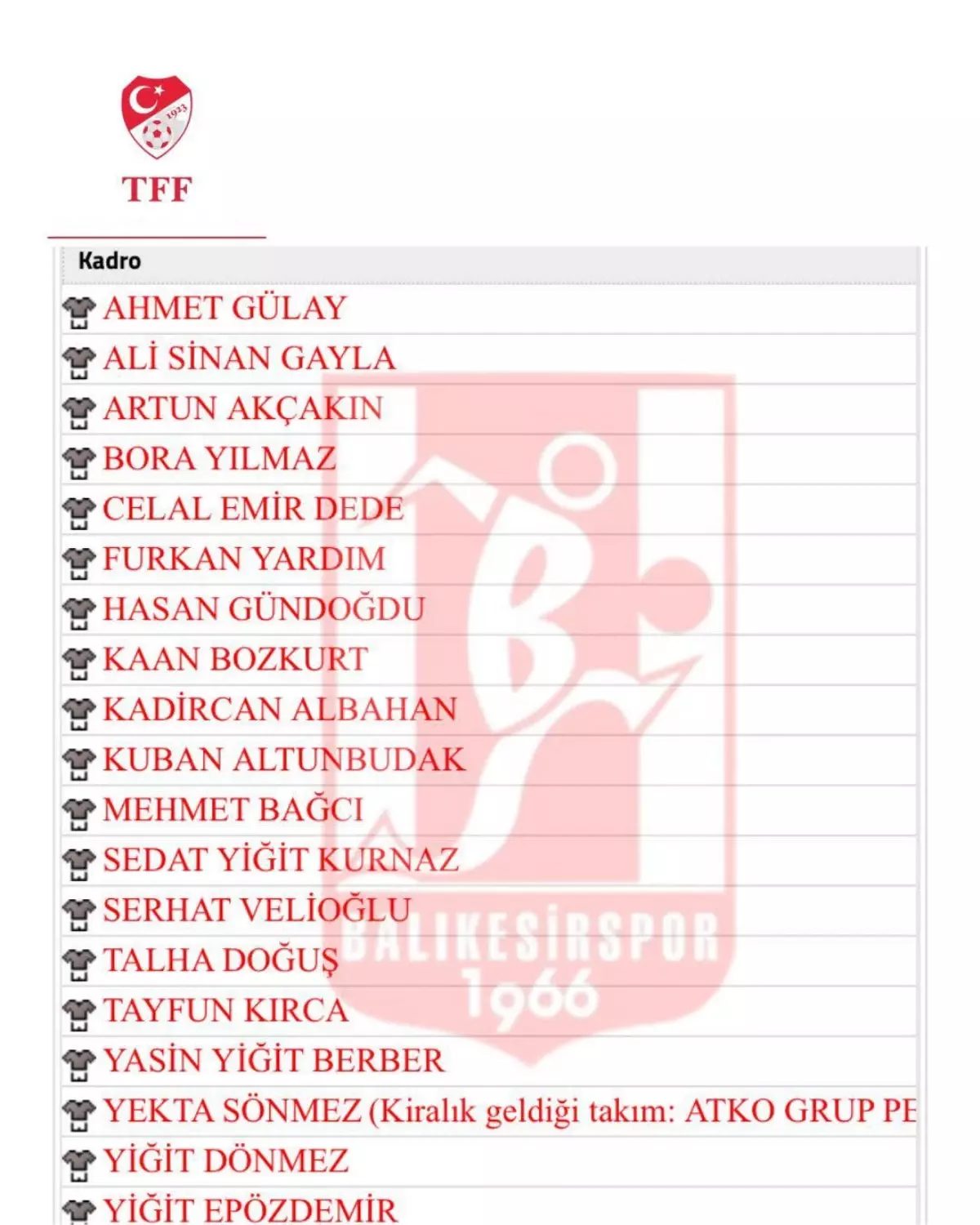 Transfer yasağını kaldıran yönetim oyuncuların lisanslarını çıkardı. Takımda yeni transferler Ali Sinan Gayla, Kuban, Mehmet Bağcı, Hasan, Serhat, Bora, Yekta ve Furkan’ın yanı sıra kadroda geçen sezondan kalan isimlerin lisansları alındı. Futbol Federasyonu’nun internet sitesindeki faal takım kadrosunun görselini kulübün sosyal medya sayfalarında paylaşan Balıkesirspor, “Mücadele; Ruhumuzda var. #KuvayiMilliyeŞehriBalıkesir” paylaşımı yaptı.