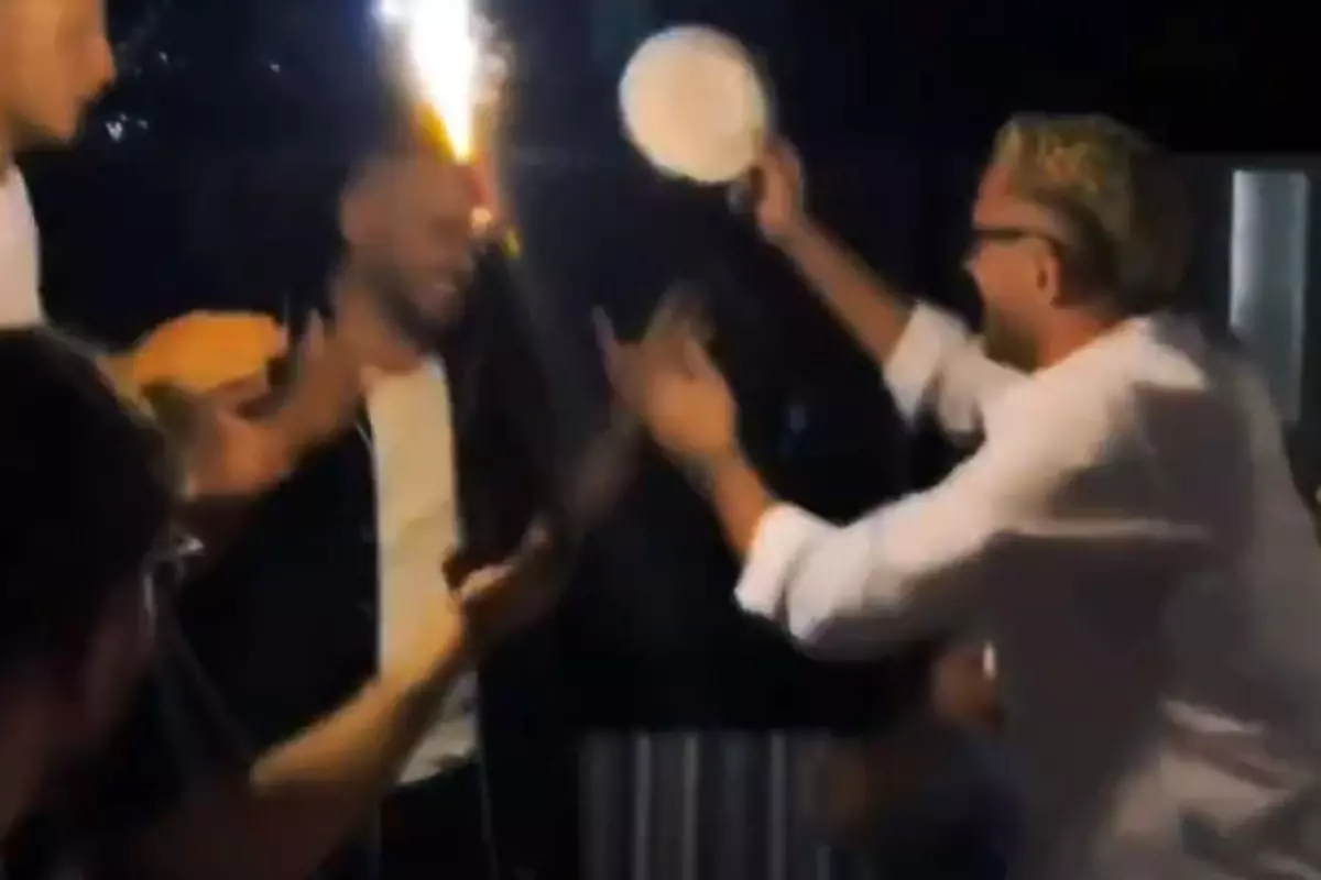 Şarkılarla kendinden geçen 25 yaşındaki isim, arkadaşının kafasında tabak kırdı. Yıldız futbolcunun bu hareketi sonrası kahkahalar yükseldi.