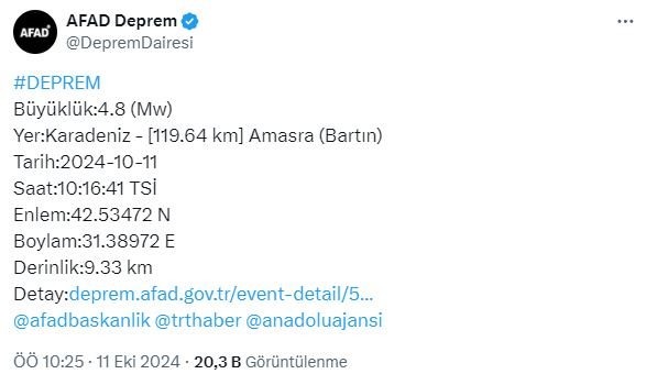 AFAD’dan yapılan açıklamaya göre, saat 10.16’da Bartın’ın Amasra ilçesi açıklarında meydana gelen deprem, karaya 120 km uzaklıkta.