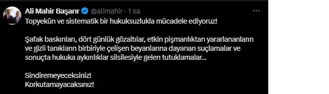 “Topyekün ve sistematik bir hukuksuzlukla mücadele ediyoruz! Şafak baskınları, dört günlük gözaltılar, etkin pişmanlıktan yararlananların ve gizli tanıkların birbiriyle çelişen beyanlarına dayanan suçlamalar ve sonuçta hukuka aykırılıklar silsilesiyle gelen tutuklamalar… Sindiremeyeceksiniz! Korkutamayacaksınız!”