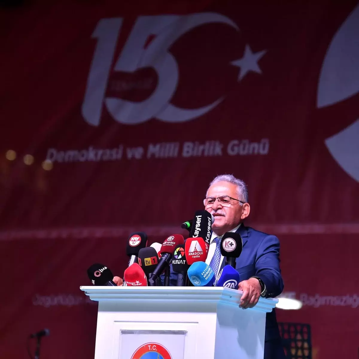 9 yıl önce hain darbe girişiminin yaşandığı gün ve takip eden günlerde Kayserililerin ortaya koyduğu iradeyi hatırlatan Büyükkılıç, “Tam 9 sene önce işte bu meydanı dolduran, ellerinde bayraklarıyla caddeleri, sokakları coşkuyla buluşturan 200 bin civarındaki gururumuz olan Kayserili hemşehrilerimiz ile ihanet şebekesine dur diyen Kayseri bu vatanın güvenli limanı. Kayseri, yerli ve milli anlayışın sahibi. Kayseri, vatanı için bayrağı için devleti için milleti için ben varım, gerekirse canımı veririm diyen bir şehir. Seyyid Burhaneddin Hazretlerinin, Mehmet Melik Gazi Hazretlerinin, Hunat Hatunların, Gevher Nesibe Sultanların, Ahi Evranların hemşehrileri Kayseri, sizler iyi ki varsınız. Sizler bu ülkenin sigortasısınız” şeklinde konuştu.