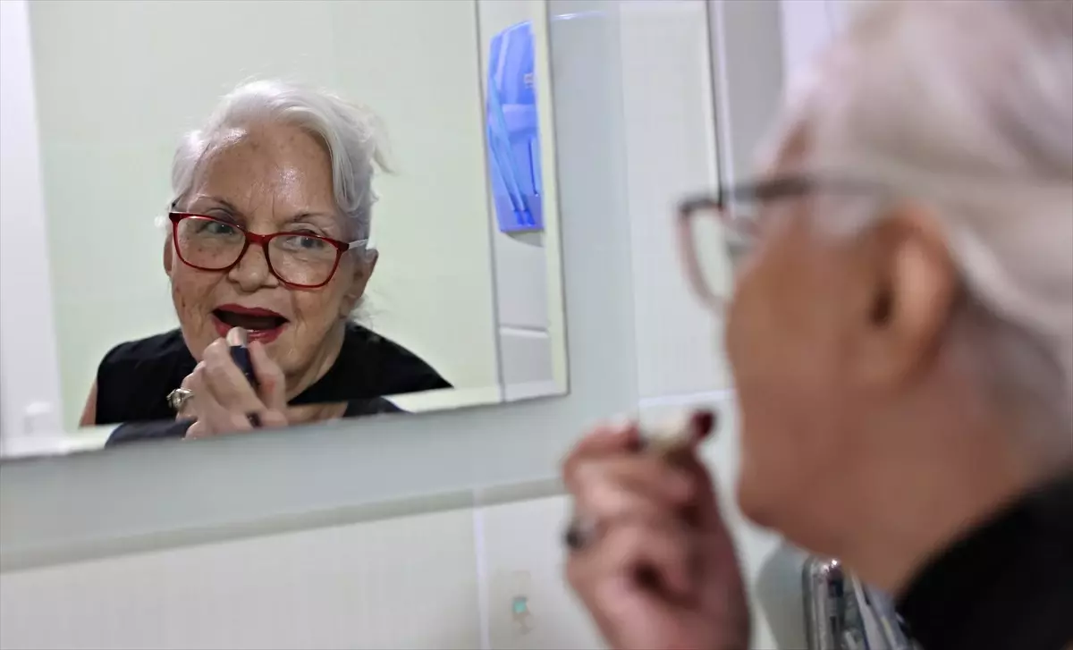 78 yaşındaki Aysel Sezer, makyajı ve renkli kıyafetleriyle huzurevinde neşe saçıyor.