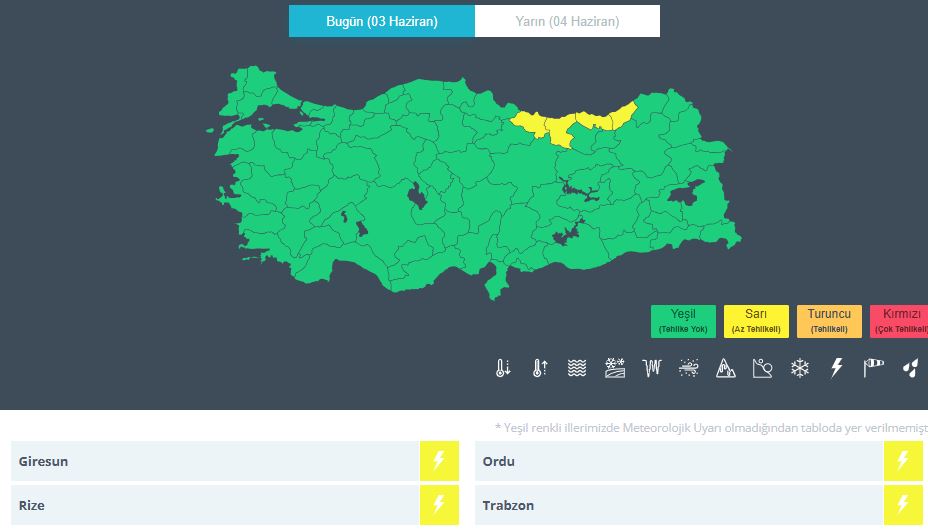 Yağışların; Samsun’un doğusu, Ordu, Giresun, Trabzon ve Rize çevrelerinde yerel kuvvetli olması beklendiğinden yaşanabilecek olumsuzluklara karşı dikkatli ve tedbirli olunması yönünde uyarıda bulunuldu.