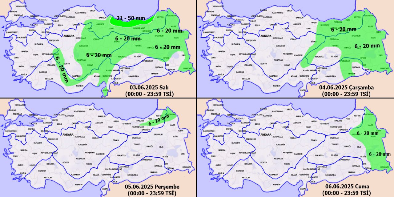Rapora göre; Orta Akdeniz’in Toroslar Mevkii, Doğu Akdeniz’in kuzey ve doğusu, İç Anadolu (Eskişehir haric), Orta ve Doğu Karadeniz, Doğu Anadolu’nun kuzeyi ile Van’ın güney ve doğusu, Isparta’nın doğusu, Hatay’ın batısı, Malatya, Bitlis, Hakkari, Muş ve Bingöl çevrelerinin aralıklı sağanak ve gök gürültülü sağanak yağışlı geçeceği tahmin ediliyor.