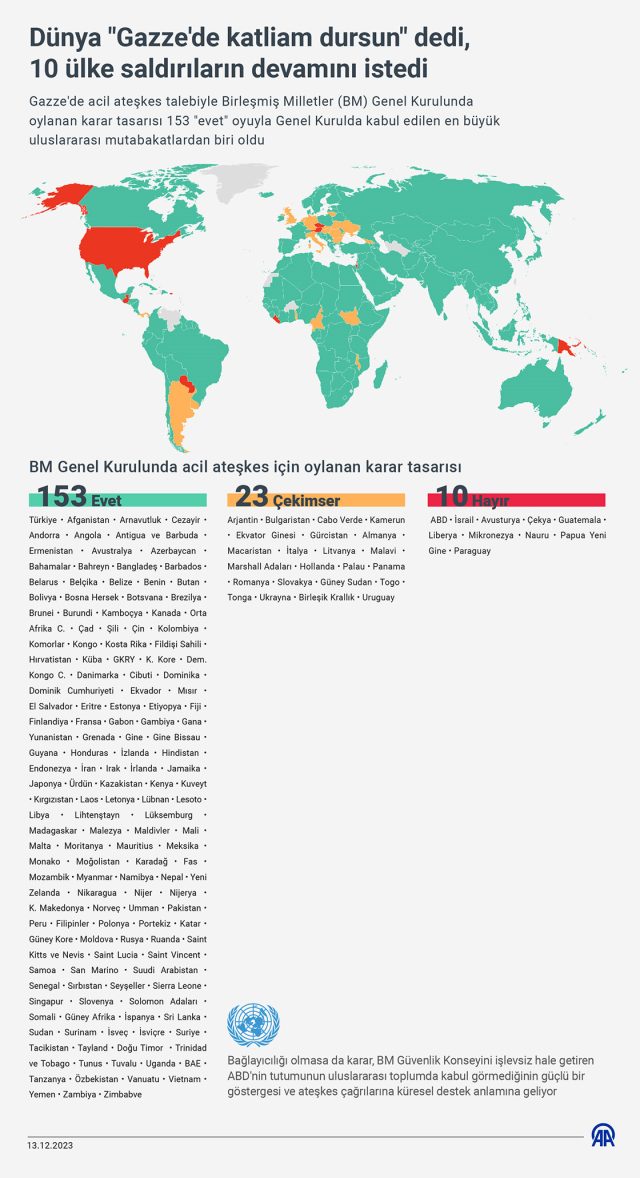 Tüm dünya bölgeden gelen haberlere kilitlenmişken bölgede savaşın bitmesini hangi ülkelerin istediği, hangi ülkelerin “savaştan” yana tavır aldığı da merak ediliyor. Birleşmiş Milletler Genel Kurulu, Gazze’deki savaşta derhal, koşulsuz ve kalıcı bir ateşkes talep eden kararı açıklamıştı. Genel Kurulda oylanan tasarı, 193 ülkeden 153’ünün desteğini alırken yalnızca 10 ülke tarafından reddedilmişti.