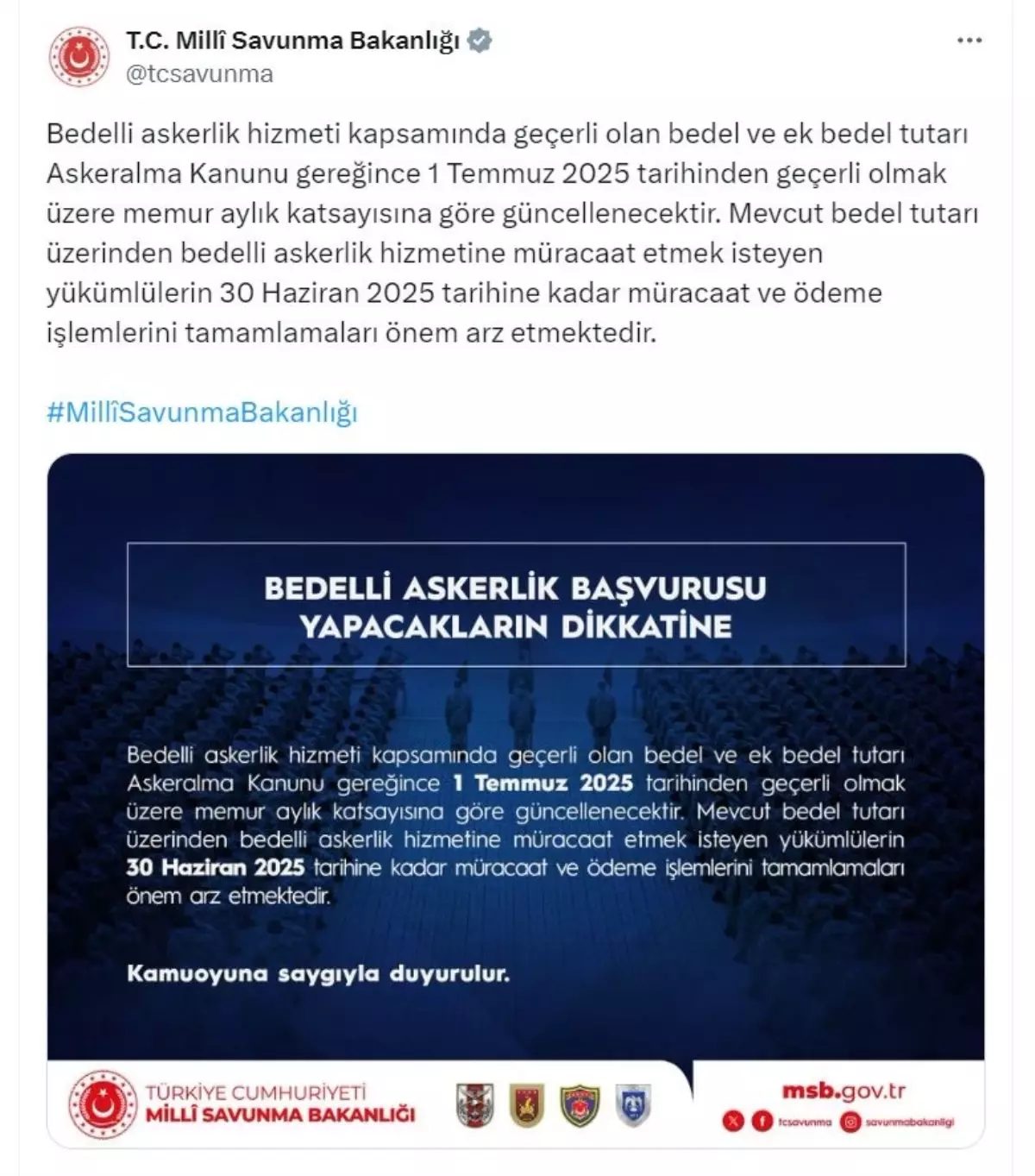 Bakanlığın sosyal medya hesabından yapılan açıklamada, “Bedelli askerlik hizmeti kapsamında geçerli olan bedel ve ek bedel tutarı Askeralma Kanunu gereğince 1 Temmuz 2025 tarihinden geçerli olmak üzere memur aylık katsayısına göre güncellenecektir. Mevcut bedel tutarı üzerinden bedelli askerlik hizmetine müracaat etmek isteyen yükümlülerin 30 Haziran 2025 tarihine kadar müracaat ve ödeme işlemlerini tamamlamaları önem arz etmektedir” denildi.