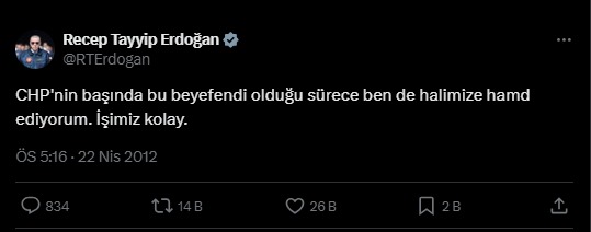 2012 yılında Kılıçdaroğlu’nun CHP’nin başına gelmesinden iki sene sonra Erdoğan’ın bir tweeti var. 22 Nisan 2012 tarihinde. “Bu beyefendi CHP’nin başında olduğu sürece ben de halimize hamd ediyorum, işimiz kolay.” diyor.