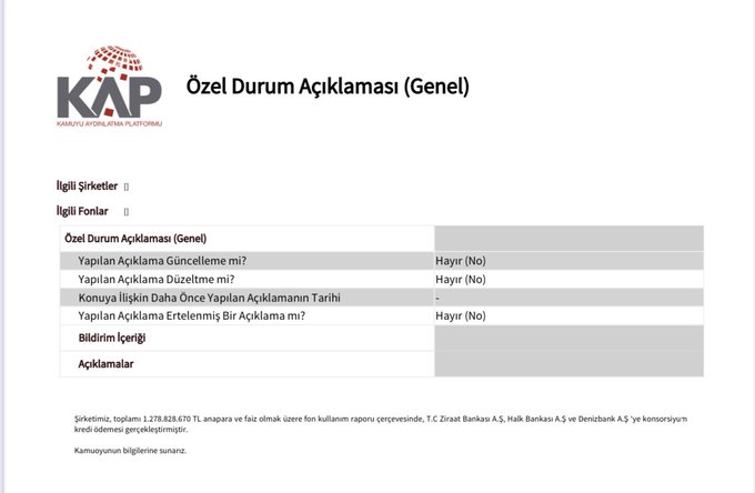 “Şirketimiz, toplamı 1.278.828.670 TL anapara ve faiz olmak üzere fon kullanım raporu çerçevesinde, T.C Ziraat Bankası A.Ş, Halk Bankası A.Ş ve Denizbank A.Ş’ye konsorsiyum kredi ödemesi gerçekleştirmiştir.”
