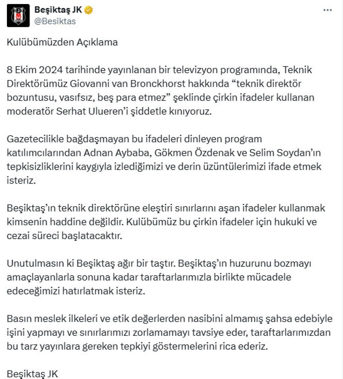 8 Ekim 2024 tarihinde yayınlanan bir televizyon programında, Teknik Direktörümüz Giovanni van Bronckhorst hakkında “teknik direktör bozuntusu, vasıfsız, beş para etmez” şeklinde çirkin ifadeler kullanan moderatör Serhat Ulueren’i şiddetle kınıyoruz.