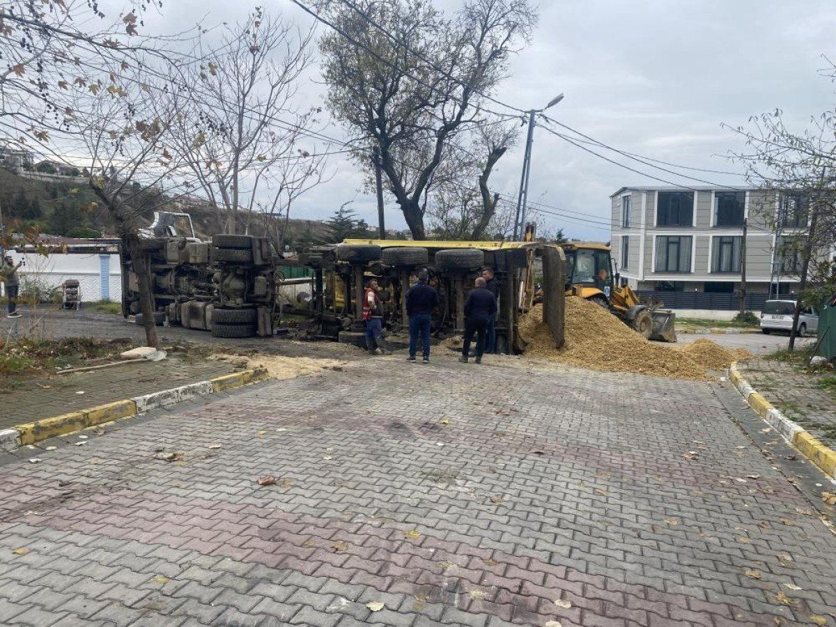 İstanbul’un Beylikdüzü ilçesine bağlı Gürpınar Mahallesi Pekmez Caddesi’nde İSKİ ekiplerinin altyapı çalışmaları yaptığı alana mıcır dökmek için gelen 34 GF 4291 plakalı hafriyat kamyonu, yolun bir kısmında oluşan çökme sonucunda devrildi.