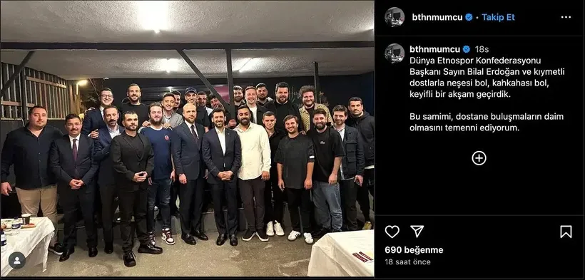 Batuhan Mumcu, paylaşımında “Dünya Etnospor Konfederasyonu Başkanı Sayın Bilal Erdoğan ve kıymetli dostlarla neşesi bol, kahkahası bol, keyifli bir akşam geçirdik. Bu samimi, dostane buluşmaların daim olmasını temenni ediyorum.” ifadelerini kullandı.