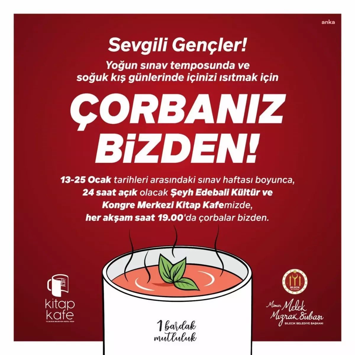 Bilecik’te lise ve üniversite öğrencilerinin ders çalışmalarına ve verimli zaman geçirmelerine imkan sağlamak amacıyla Şeyh Edebali Kültür ve Kongre Merkezi’nde açılan Kitap Kafe’de öğrencilere vize ve final sınavları boyunca çorba ikramı yapılıyor.